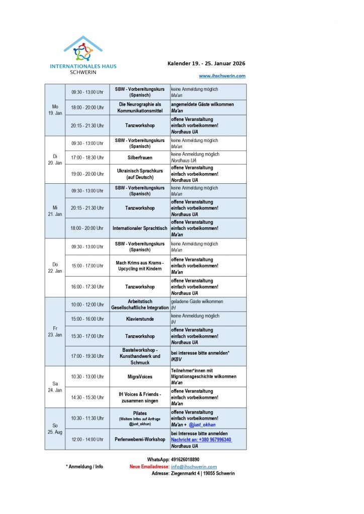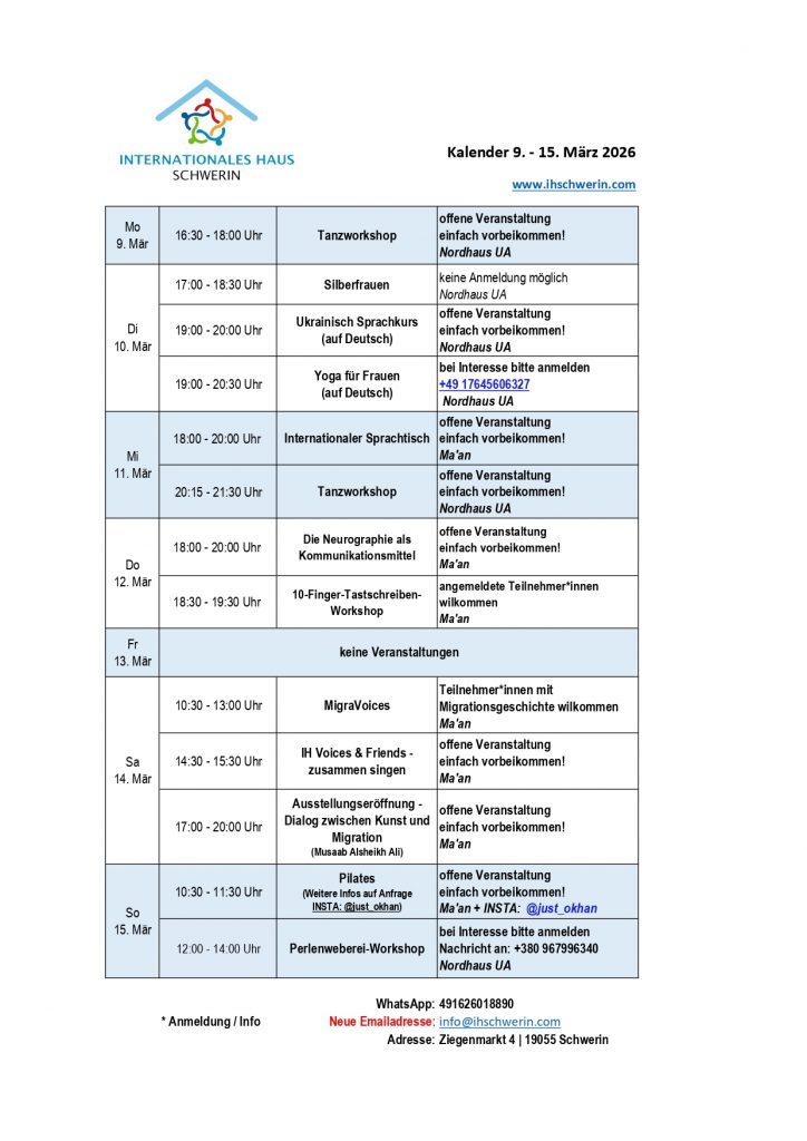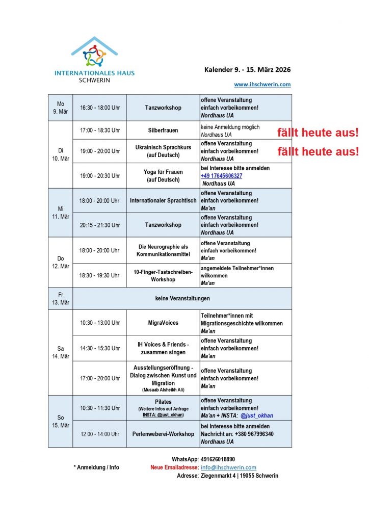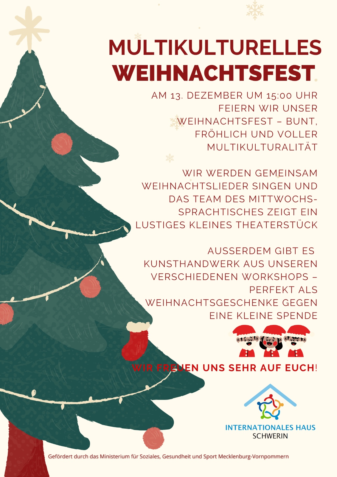 Ziel des Internationalen Hauses Schwerin (IHS) ist es, einen Ort des Austauschs und der Begegnung zu schaffen, an dem kulturelle Vielfalt gelebt und erlebbar wird. Das IHS ist ein wichtiger Anlaufpunkt für Menschen unterschiedlicher Herkunft in Schwerin und Ansprechpartner im Bereich der Förderung der Mehrsprachigkeit und der interkulturellen Kompetenz.