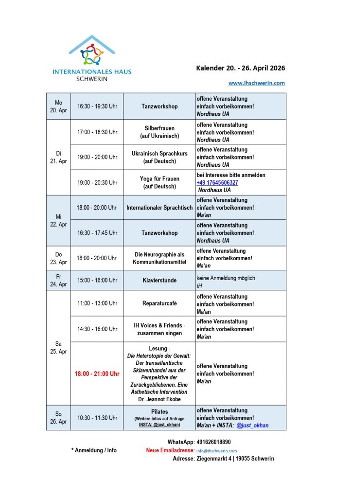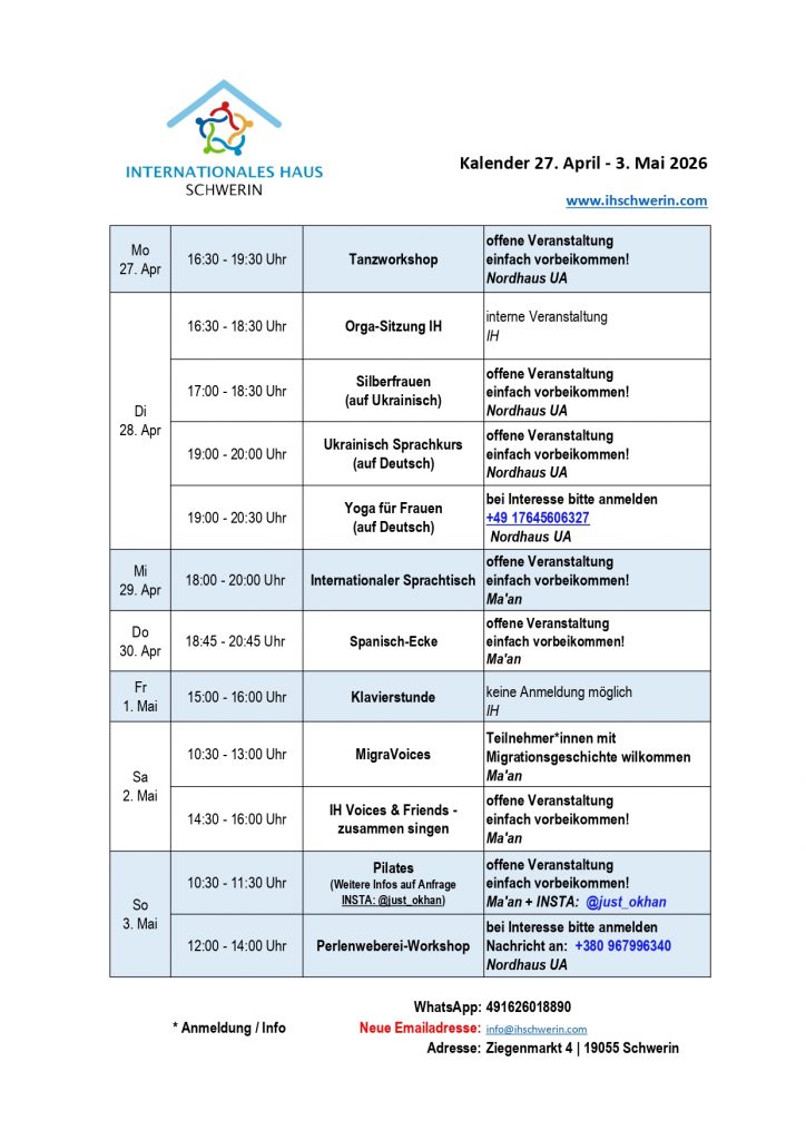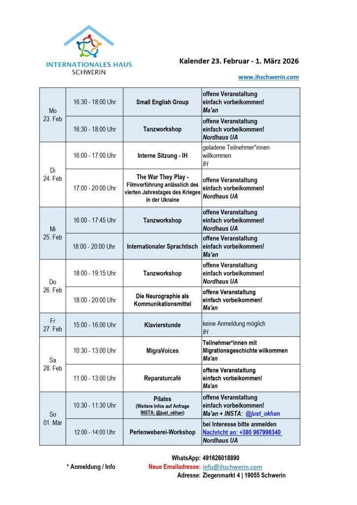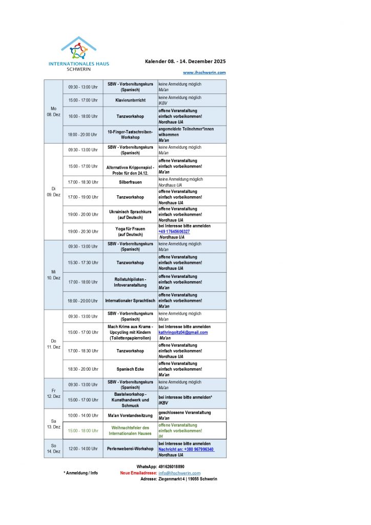 Ziel des Internationalen Hauses Schwerin (IHS) ist es, einen Ort des Austauschs und der Begegnung zu schaffen, an dem kulturelle Vielfalt gelebt und erlebbar wird. Das IHS ist ein wichtiger Anlaufpunkt für Menschen unterschiedlicher Herkunft in Schwerin und Ansprechpartner im Bereich der Förderung der Mehrsprachigkeit und der interkulturellen Kompetenz.
