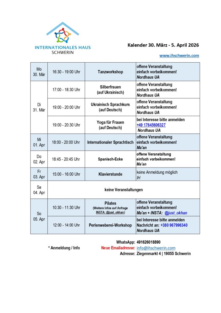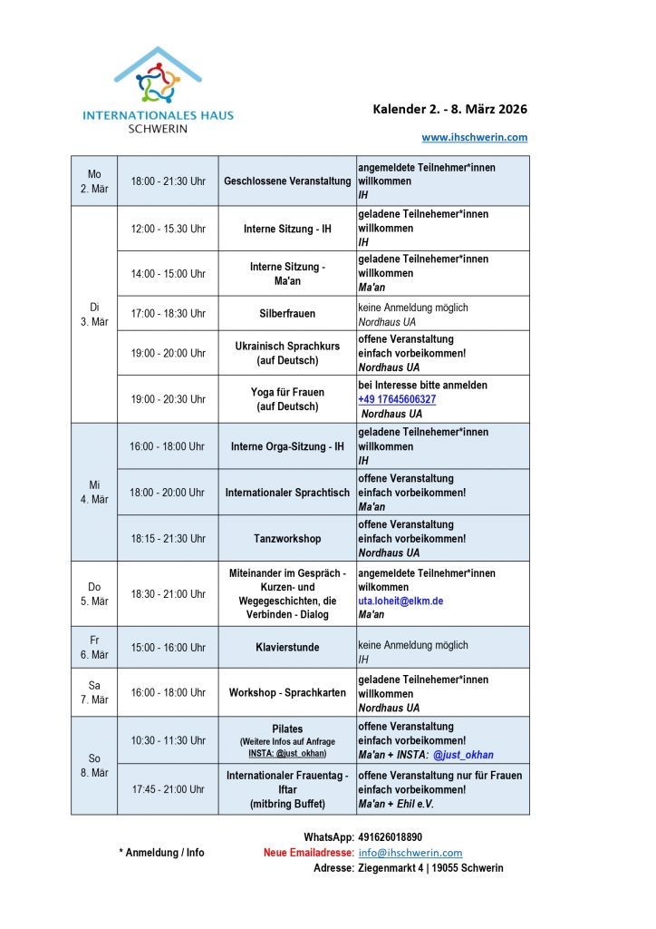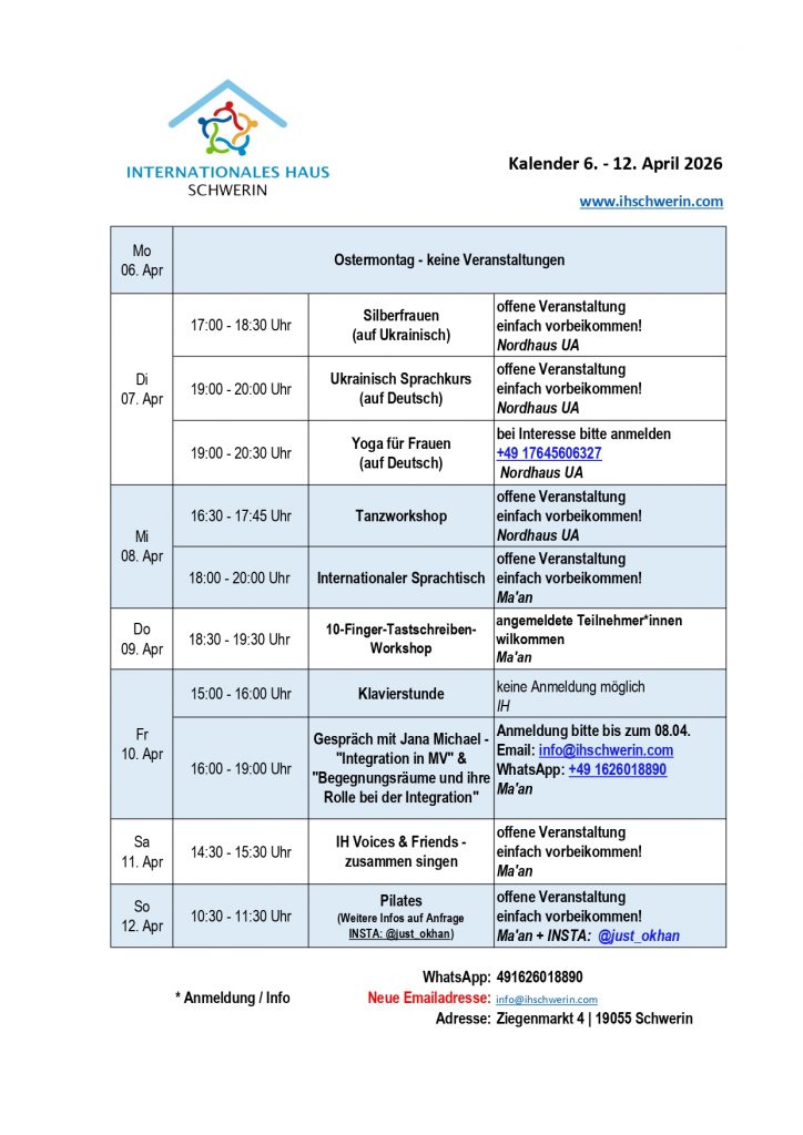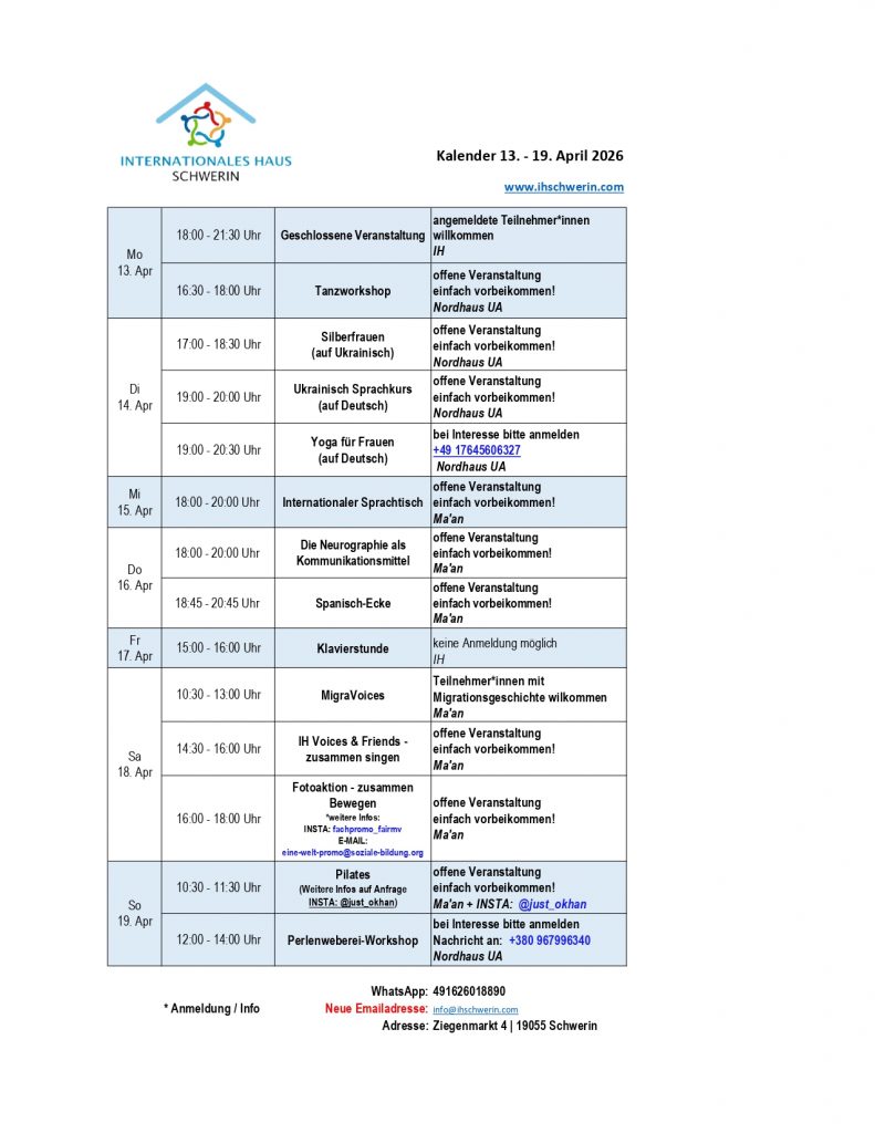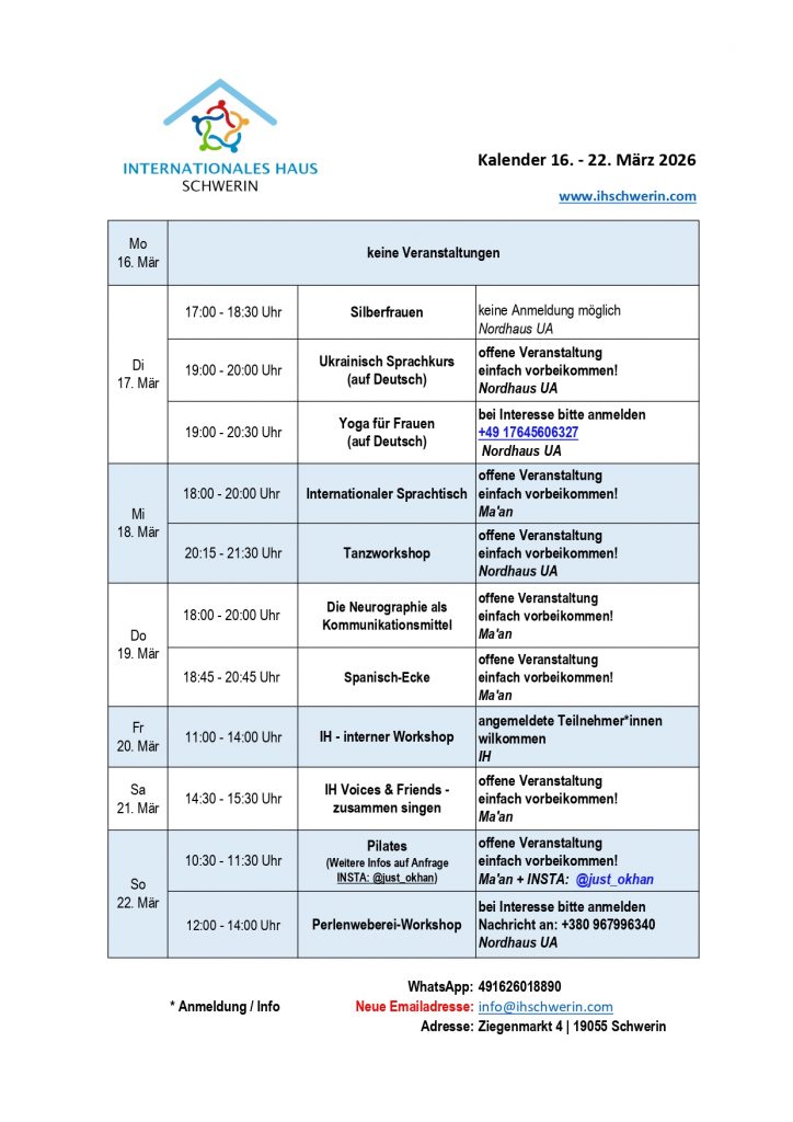 Ziel des Internationalen Hauses Schwerin (IHS) ist es, einen Ort des Austauschs und der Begegnung zu schaffen, an dem kulturelle Vielfalt gelebt und erlebbar wird. Das IHS ist ein wichtiger Anlaufpunkt für Menschen unterschiedlicher Herkunft in Schwerin und Ansprechpartner im Bereich der Förderung der Mehrsprachigkeit und der interkulturellen Kompetenz.